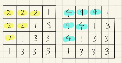 문제의 예제와 같이 위와 같은 두 배열이 있다고 하자. 우리는 새로운 구역을 찾을 때마다 모양이 다른지, 이 구역이 두 배열간 숫자가 다르다면 이 구역으로써 숫자가 다른 구역이 2개 이상이 되지 않는지를 확인하여 틀린 경우를 잡아줄 것이다.