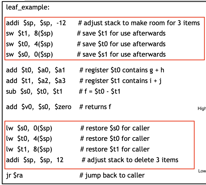 따라서 호출자에서 $t0, $t1, $s0을 사용하고 있었다고 가정할 때 $sp (스택 포인터)를 3칸(12)만큼 뒤로 보내고, 스택에 $t0, $t1, $s0을 저장해둔다. 그리고 프로시저가 종료되면 스택에서 꺼내와 다시 원래 자리에 저장해준다.