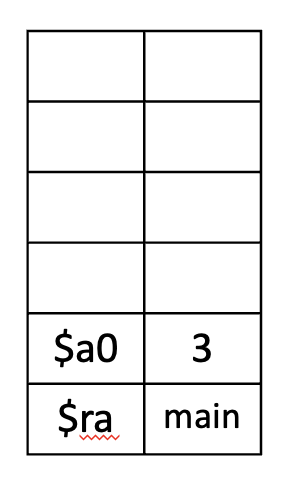 우선 스택에는 main함수를 가리키는 $ra와 3을 갖고 있는 n($a0)를 저장하게 된다.