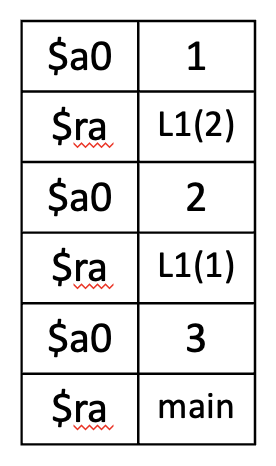이때 $ra에는 jal fact의 다음 명령어의 주소인 L1(2)가 저장된다.