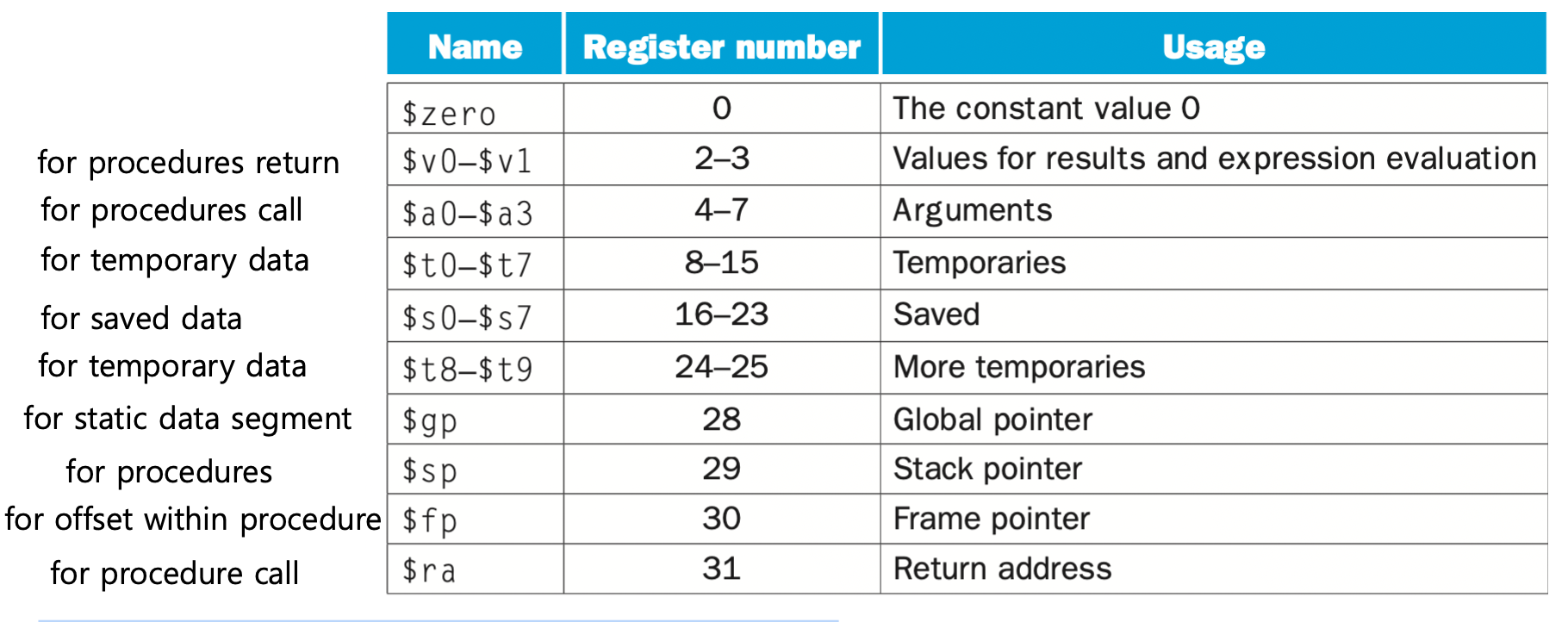 따라서 MIPS는 프레임포인터, $fp를 제공한다. 이는 프로시저 내에서 안정적인 베이스 레지스터로 사용되고 따라서 프로시저 프레임 내에서 데이터를 찾는 것이 더욱 쉬워진다. 다만 프로시저가 호출되거나 반환될 때마다 $sp와 마찬가지로 $fp도 조정되어야 한다. 따라서 프로시저가 시작되거나 종료될 때 $fp와 $sp를 조정해서 스택의 무결성을 유지해야 한다.