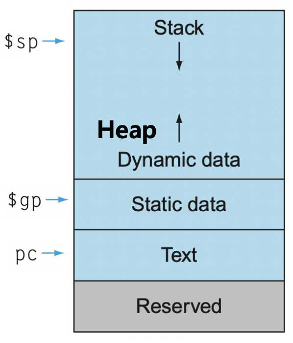 MIPS에서 메모리 공간은 4가지 영역으로 나뉜다. - 스택, 힙, 정적 데이터 세그먼트, 텍스트 세그먼트