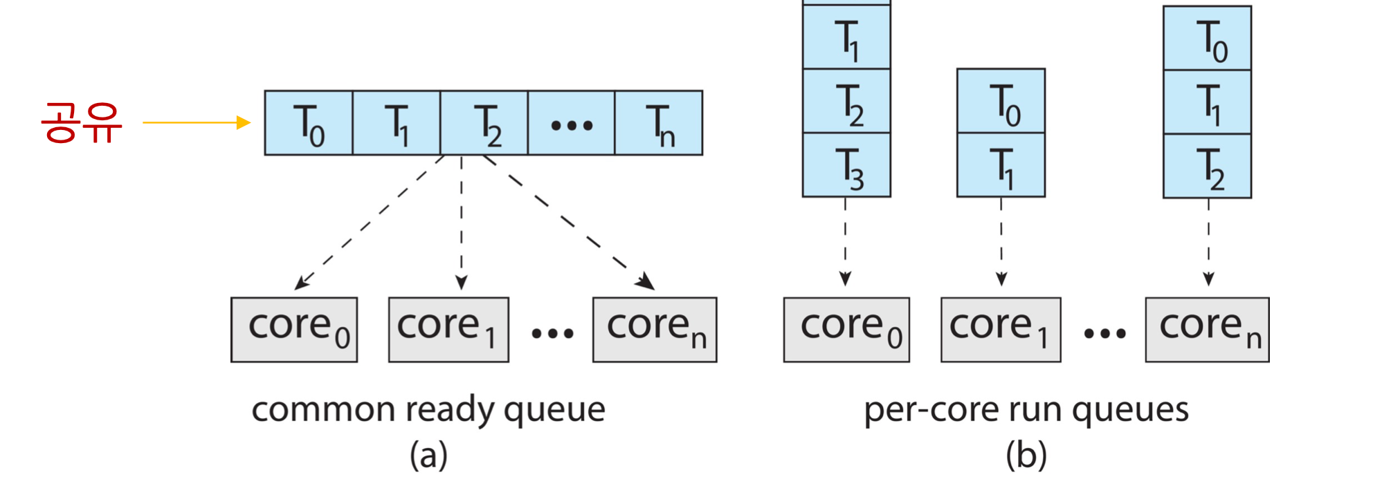 각 프로세서는 자체적인 개별 스레드 큐(b)를 가질 수 있다.