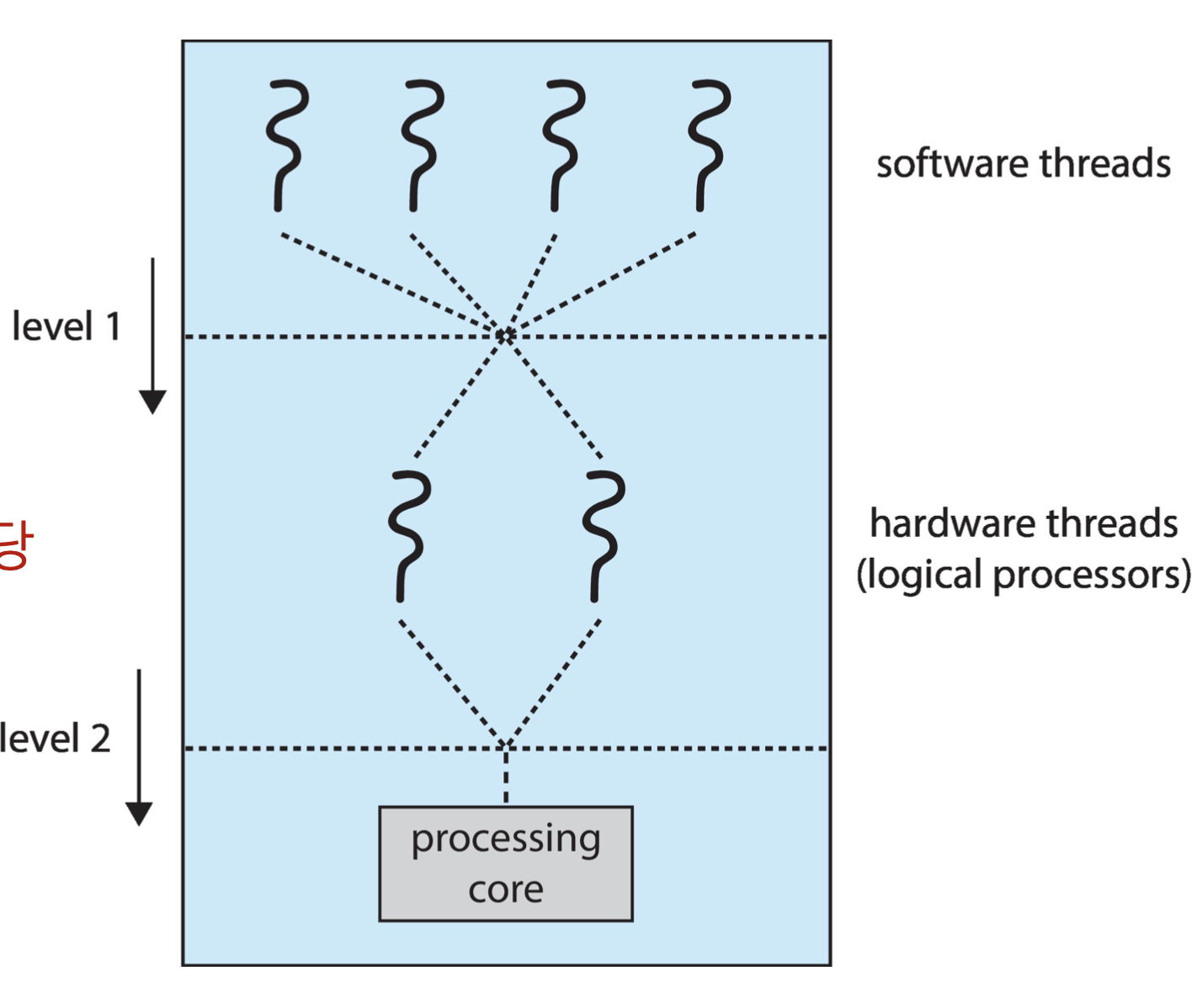 쿼드코어 시스템에서 코어 당 하드웨어 스레드가 2개씩 있는 경우, 운영체제는 8개의 논리 프로세서로 본다.