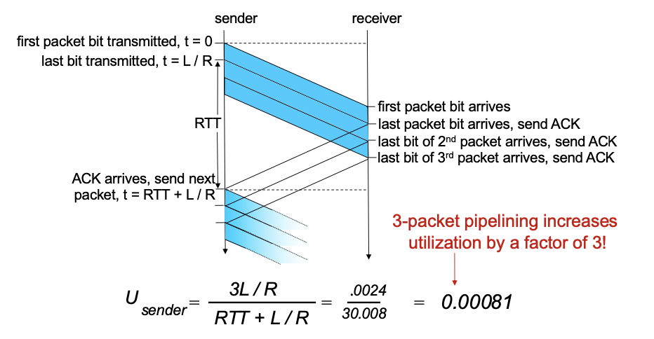 같은 패킷을 3개 보낸다고 하면 U(sender) = (3*L/R) / (RTT + L/R) 으로 0.00081이 된다.