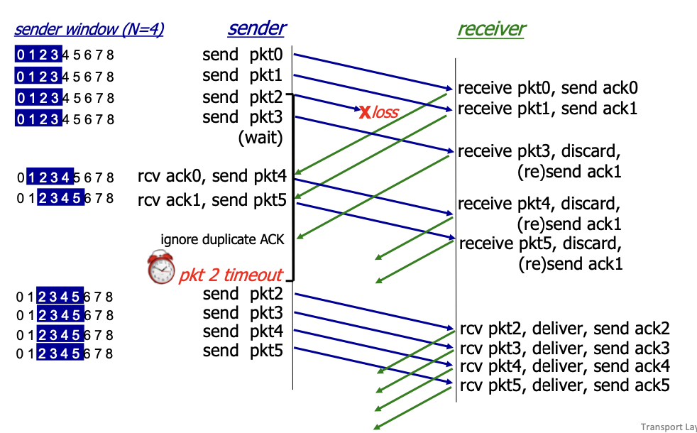 sender는 0,1번은 ACK가 왔기에 다음번으로 늘려서 4,5번 패킷을 보낸다. 2번 패킷에 대해 타임아웃이 되면, 다시 보낸다. 3,4,5번 패킷에 대해서도 타임아웃으로 인해 재전송한다.