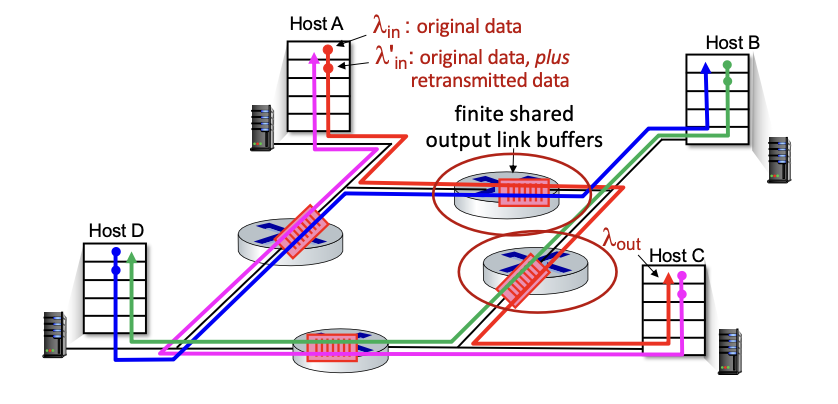 설정 : 4 senders, multi-hop paths(경로에 여러 중간 노드), timeout/retransmit