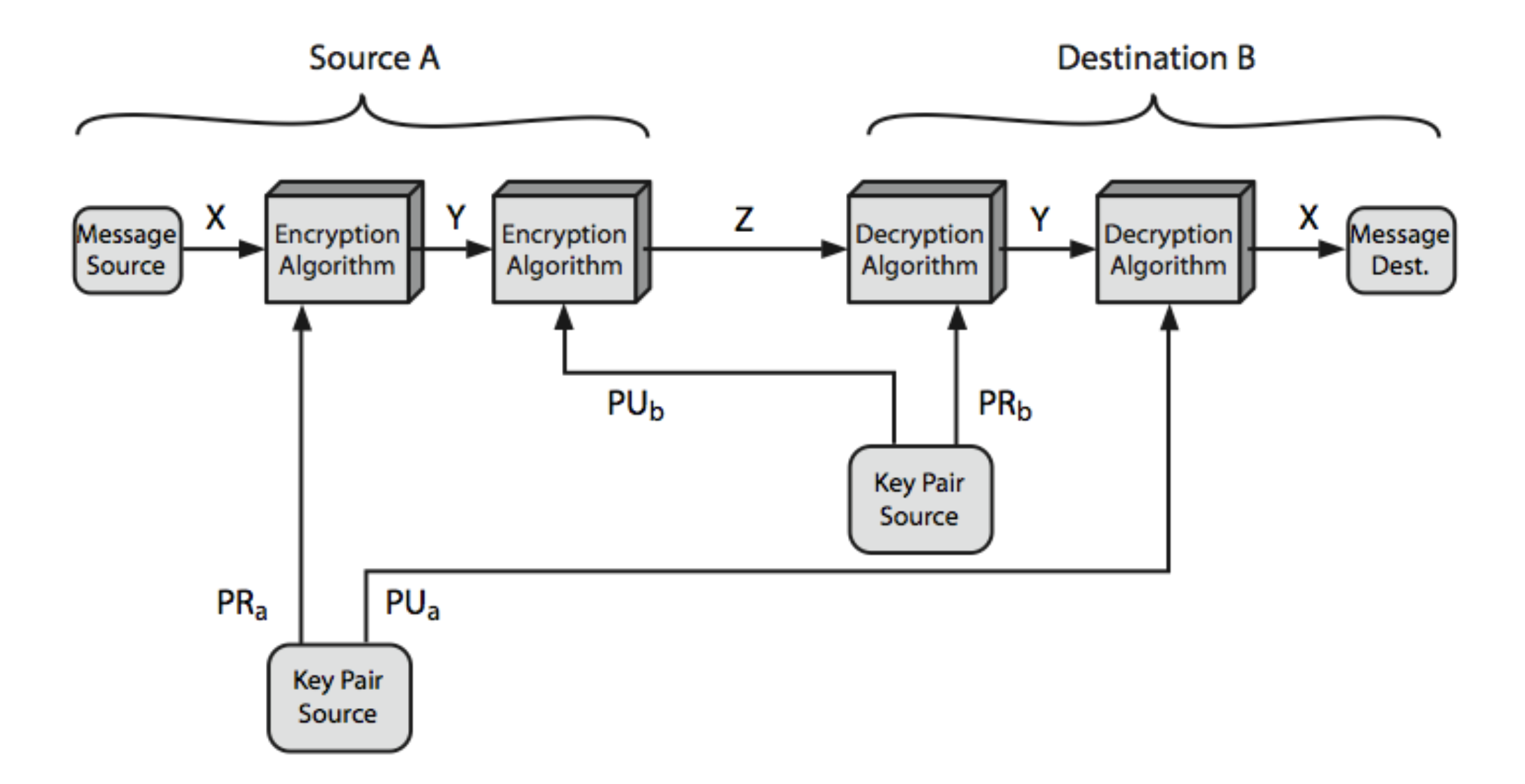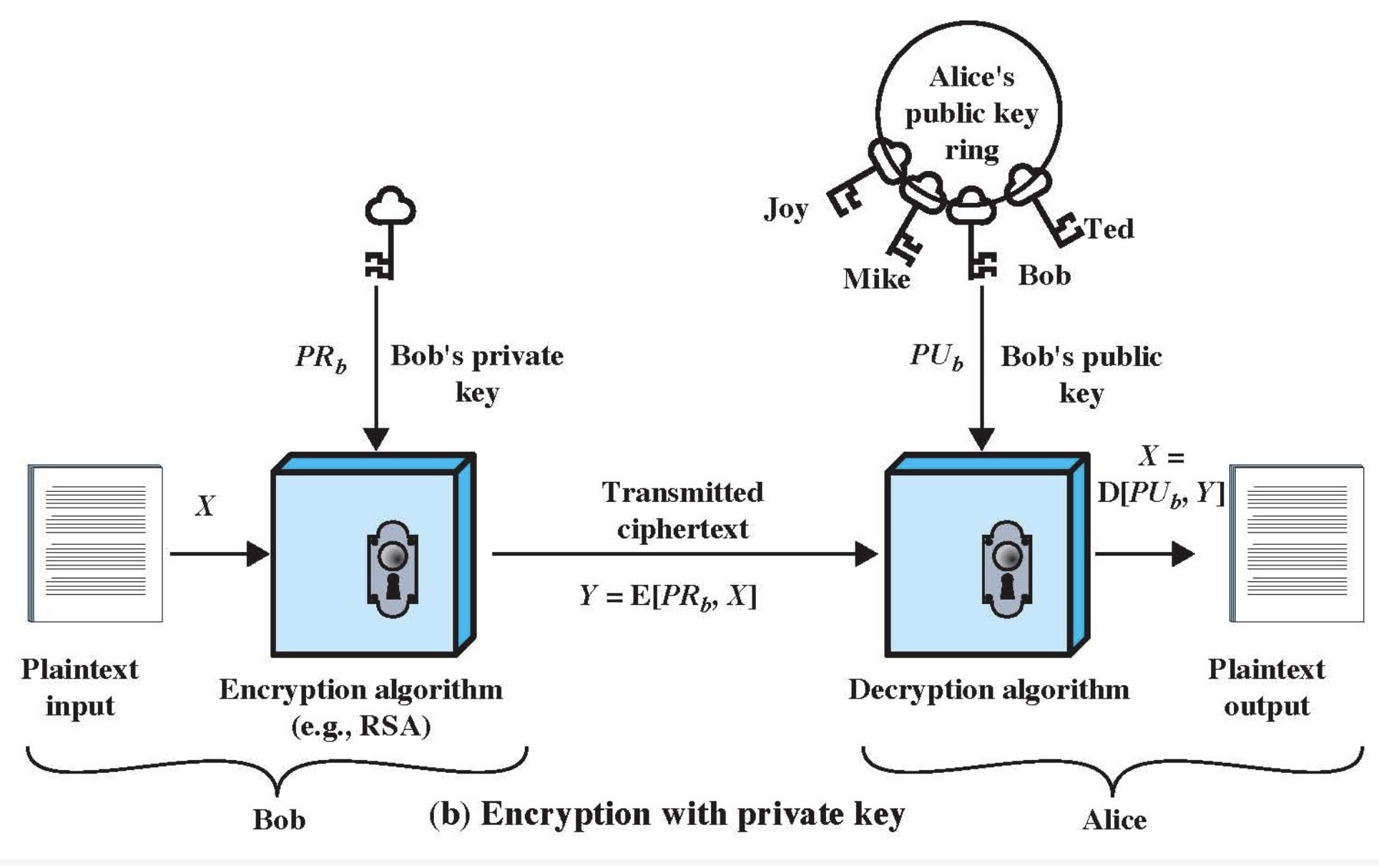 위에서는 Bob은 자신의 개인키, PRb를 가지고 있고 Alice는 Bob의 공개키 PUb를 가지고 있다.