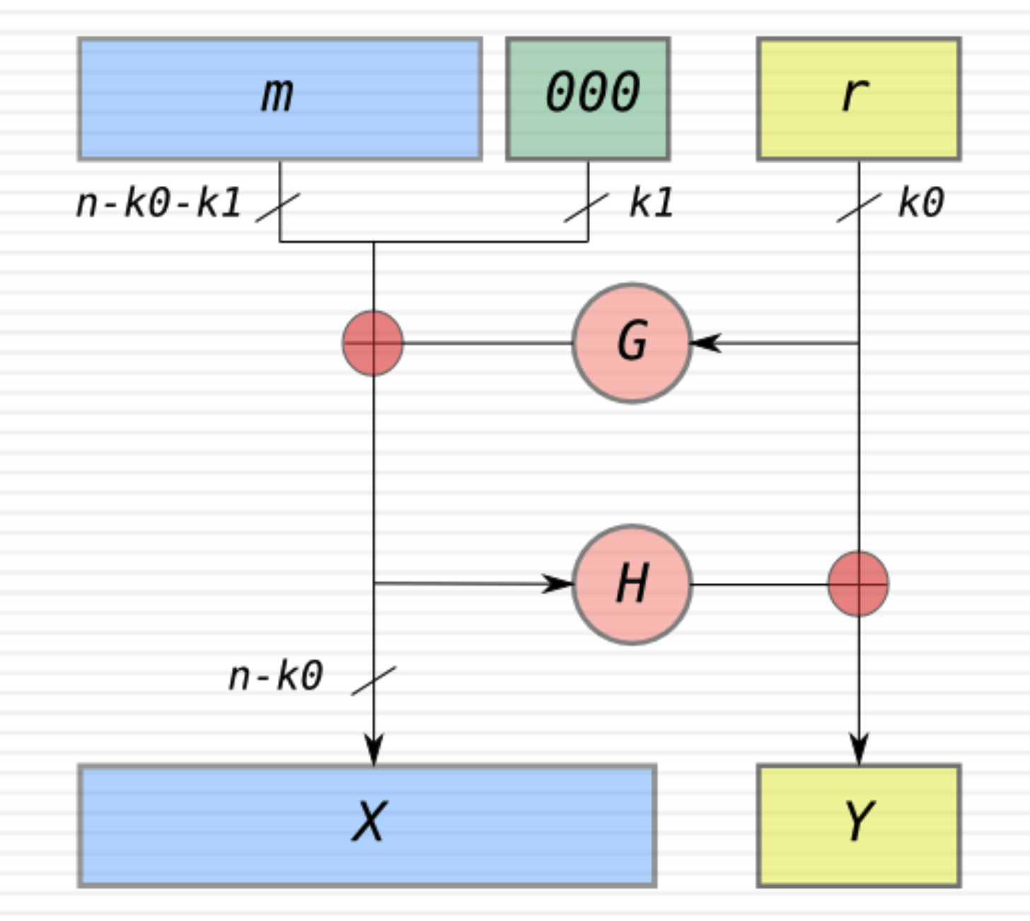 m + padding에 G(r)을 XOR한 값을 X에, H(X)와 r을 XOR한 값을 Y에 넣는다.