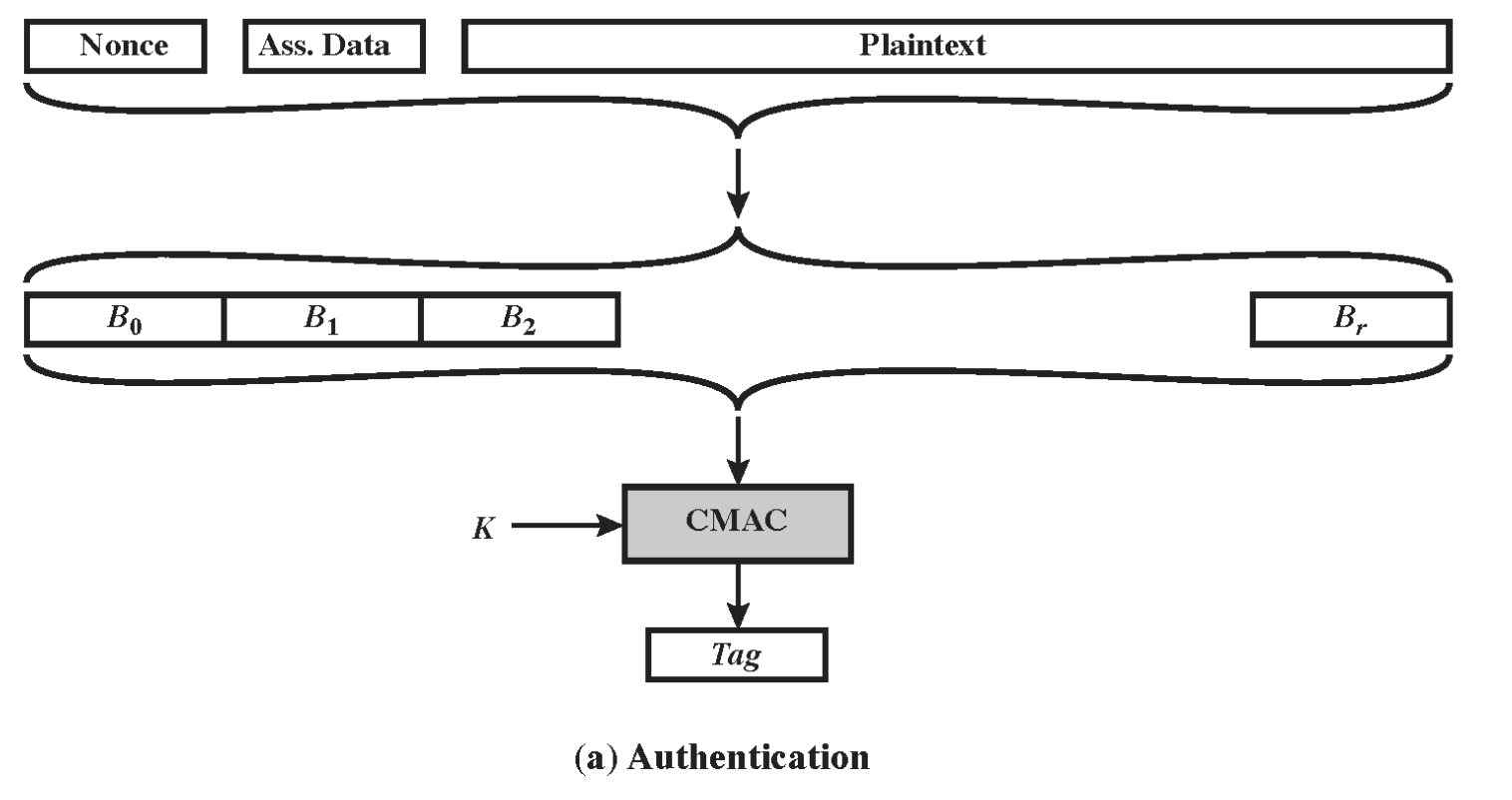 먼저 MAC 생성은, 랜덤값 Nonce와 메시지의 일부이지만 암호화되지 않고 인증만 되는 데이터 (예시 - 헤더 정보) Ass.Data, 그리고 메시지를 합친다.