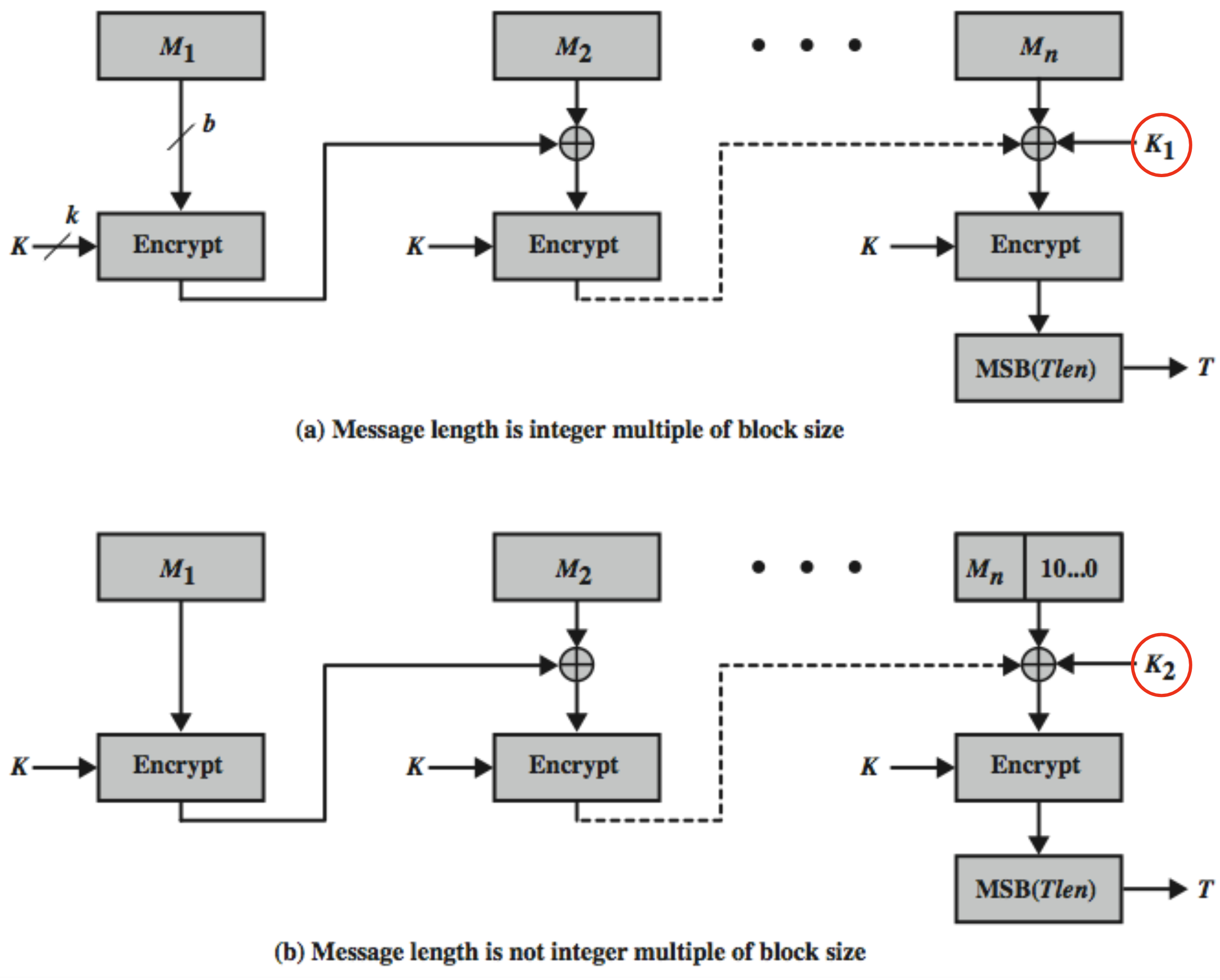 3-b. 그렇지 않을 경우, 마지막 블록 Mn은 패딩이 추가된 후 다른 특수한 키 K2와 XOR된 후 암호화된다.
