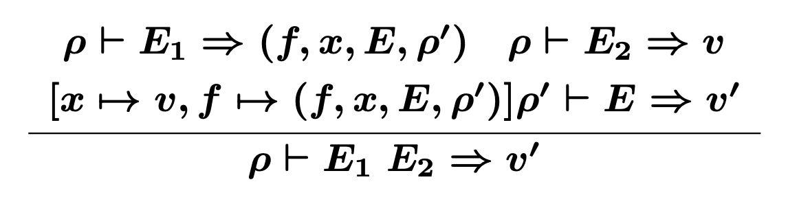 [x ↦ v, f ↦ (f,x,E,p')]p' 에서 표현식 E가 v'로 평가된다면,