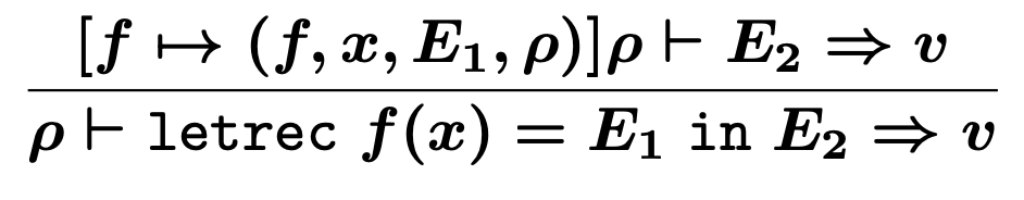 letrec f(x)에서, 환경에는 f ↦ (f, x, (f x), []) 가 저장되며 자기 자신을 참조할 수 있도록 한다.