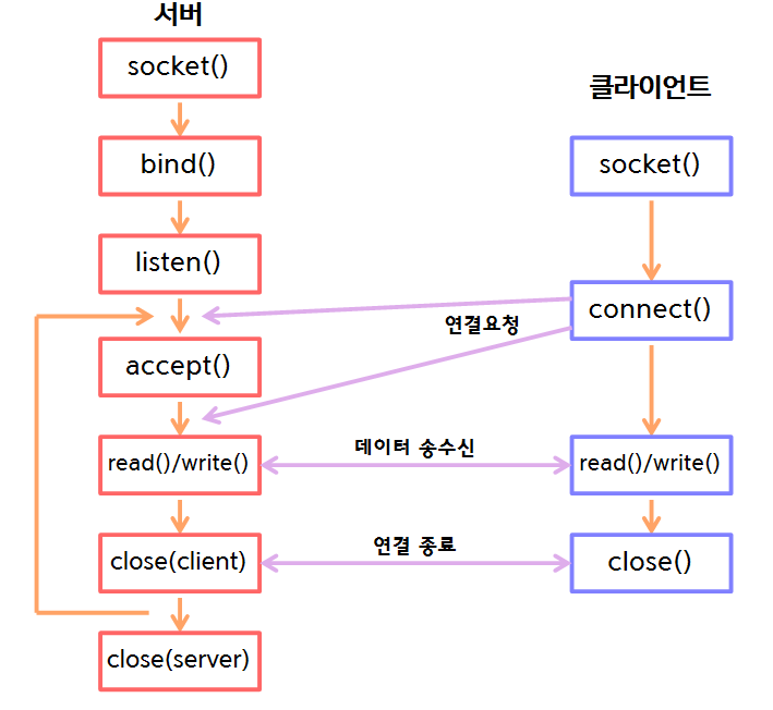 위 그림은 Iterative 서버의 함수호출 순서, TCP 서버-클라이언트 구현을 나타낸 것입니다.