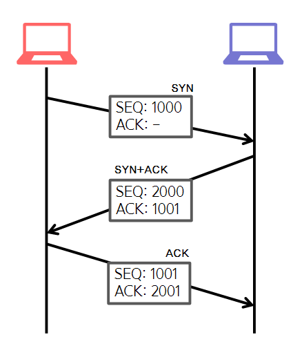 소켓은 전 이중 방식으로 동작하므로 양뱡향으로 데이터를 주고받을 수 있습니다. 따라서 데이터 송수신을 하기 이전에 준비가 필요한데, 먼저 연결요청을 하는 호스트 A가 B에게 [SEQ:1000 ACK:-]를 전달합니다.