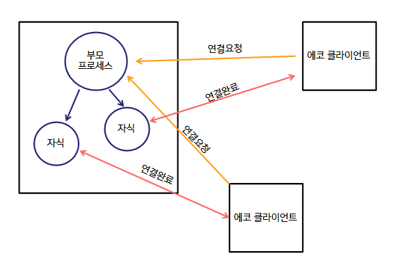 위 그림은 이번에 구현할 멀티프로세스 기반 다중접속 에코 서버의 구현모델입니다. 클라이언트의 수가 둘이면 두 개의 자식 프로세스, 다섯이면 5 개의 자식 프로세스를 가지게 됩니다. 따라서 에코서버는 다음의 과정을 거쳐야 합니다.